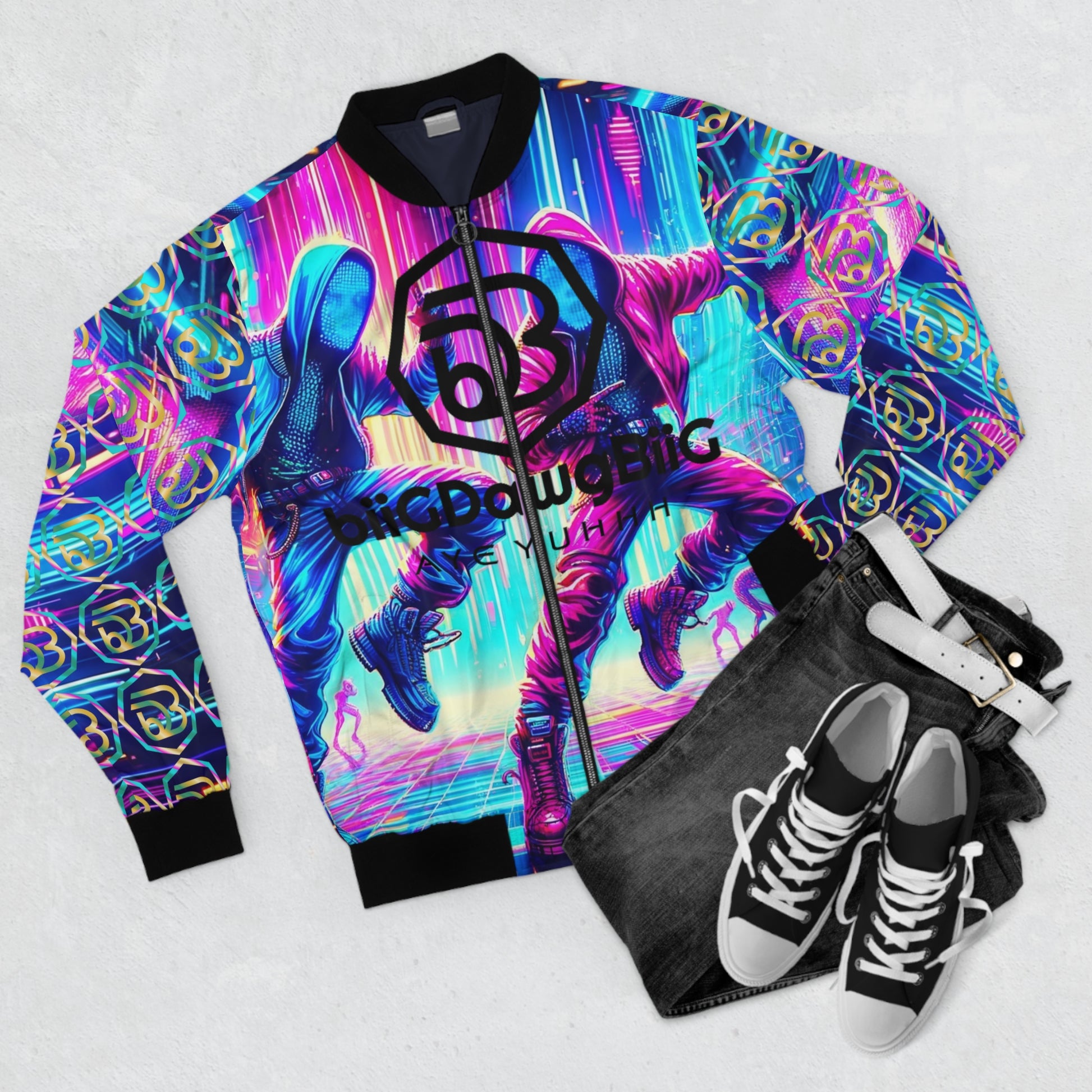 Level up your outerwear with the biiGDawgBiiG Exclusive Cyber Dance Bomber Jacket—a vivid fusion of futuristic streetwear and movement-inspired art. This all-over neon design drops you straight into a cyber dance floor, where energy pulses through every color and shape. With digital dancers mid-motion and electric streaks of blue, pink, and violet light, this jacket captures the rhythm of a virtual rave, while bold biiGDawgBiiG branding and the signature AYE YUHHH mantra shout your love for self-expression.